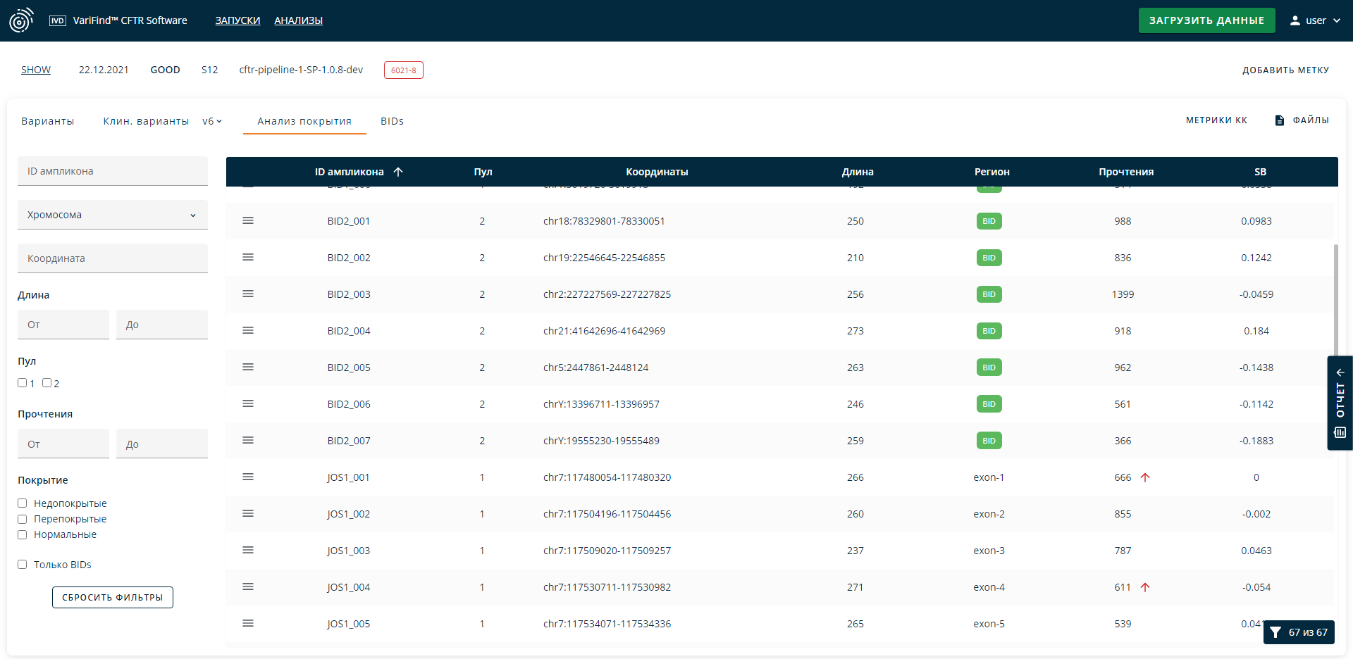 Вкладка «Анализ покрытия» позволяет увидеть число прочтений и параметр SB (strand bias) для каждого из ампликонов.