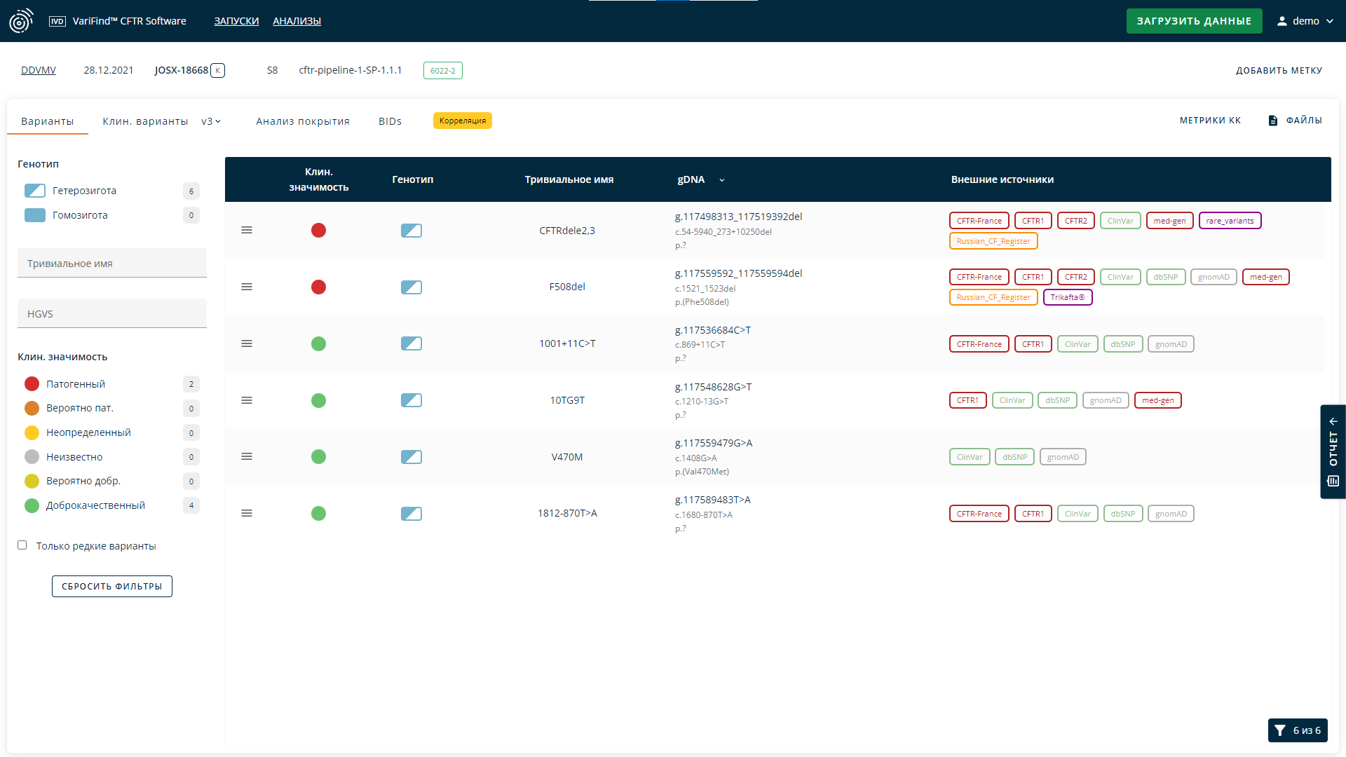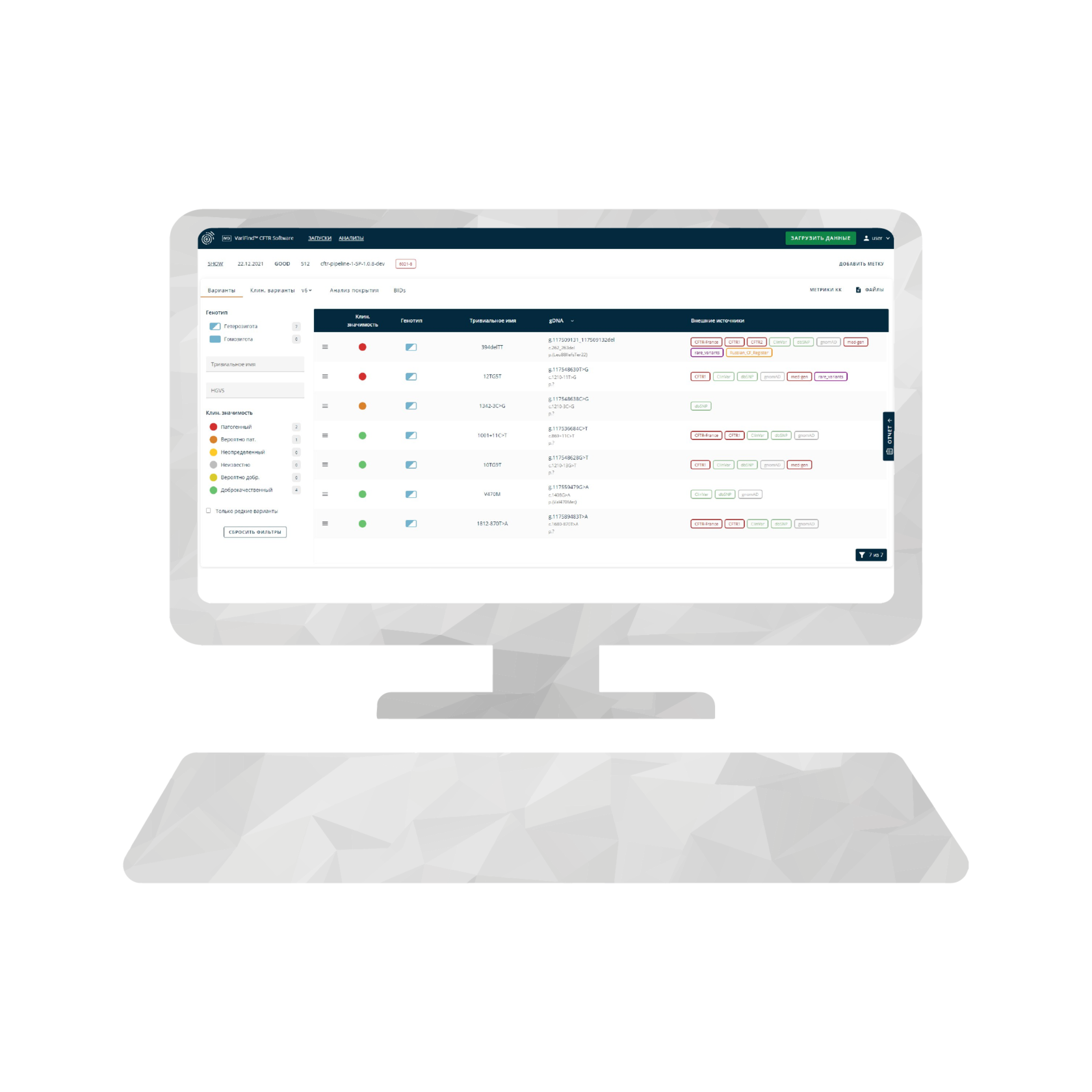 На основной рабочей вкладке визуализируются все найденные варианты с указанием клинической значимости, зиготности, тривиального названия варианта, HGVS номенклатуры, ссылок на внешние базы данных. В левом окне приводятся параметры для фильтрации и гибкого поиска.