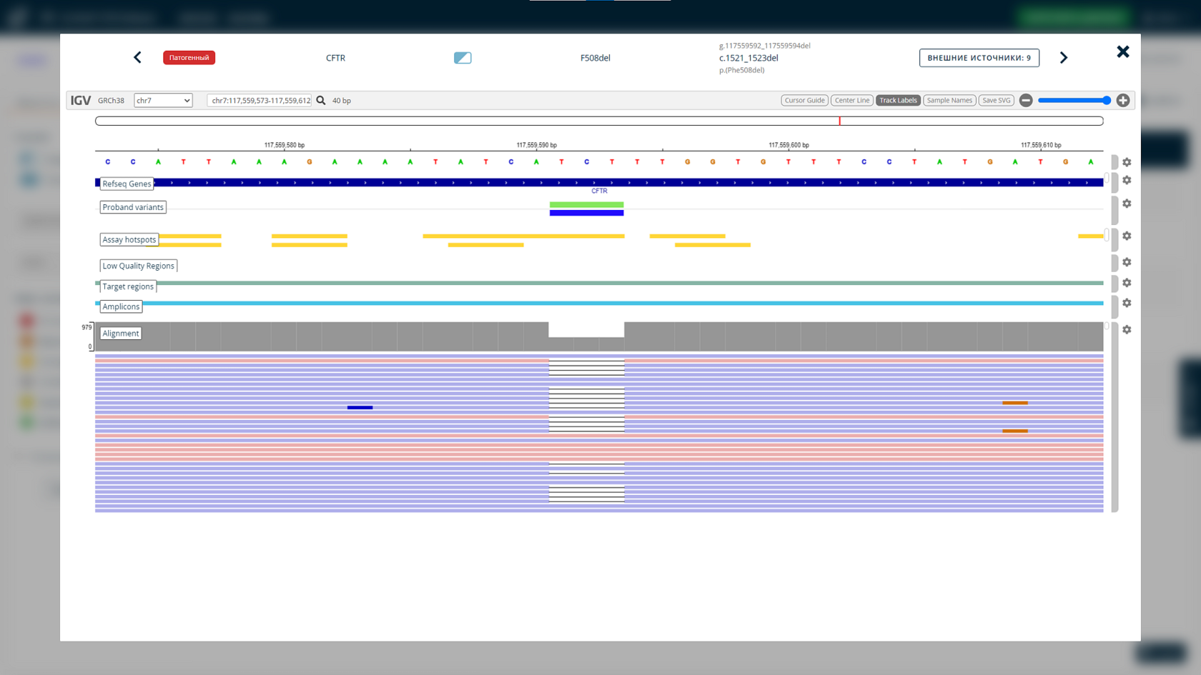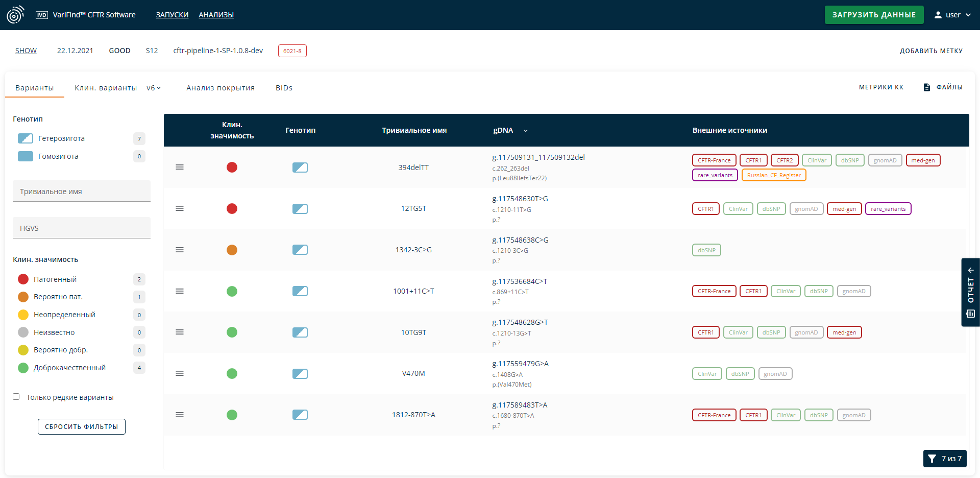Каждый значимый вариант в гене CFTR имеет клиническую аннотацию по критериям ACMG, а также перечень внешних ссылок для получения дополнительной информации. Вы всегда можете запросить уточнение клинической аннотации у нас. ПО анализирует более 700 значимых хотспотов на достоверность обнаружения и указывает в явном виде, если было выпадение хотя бы одного.