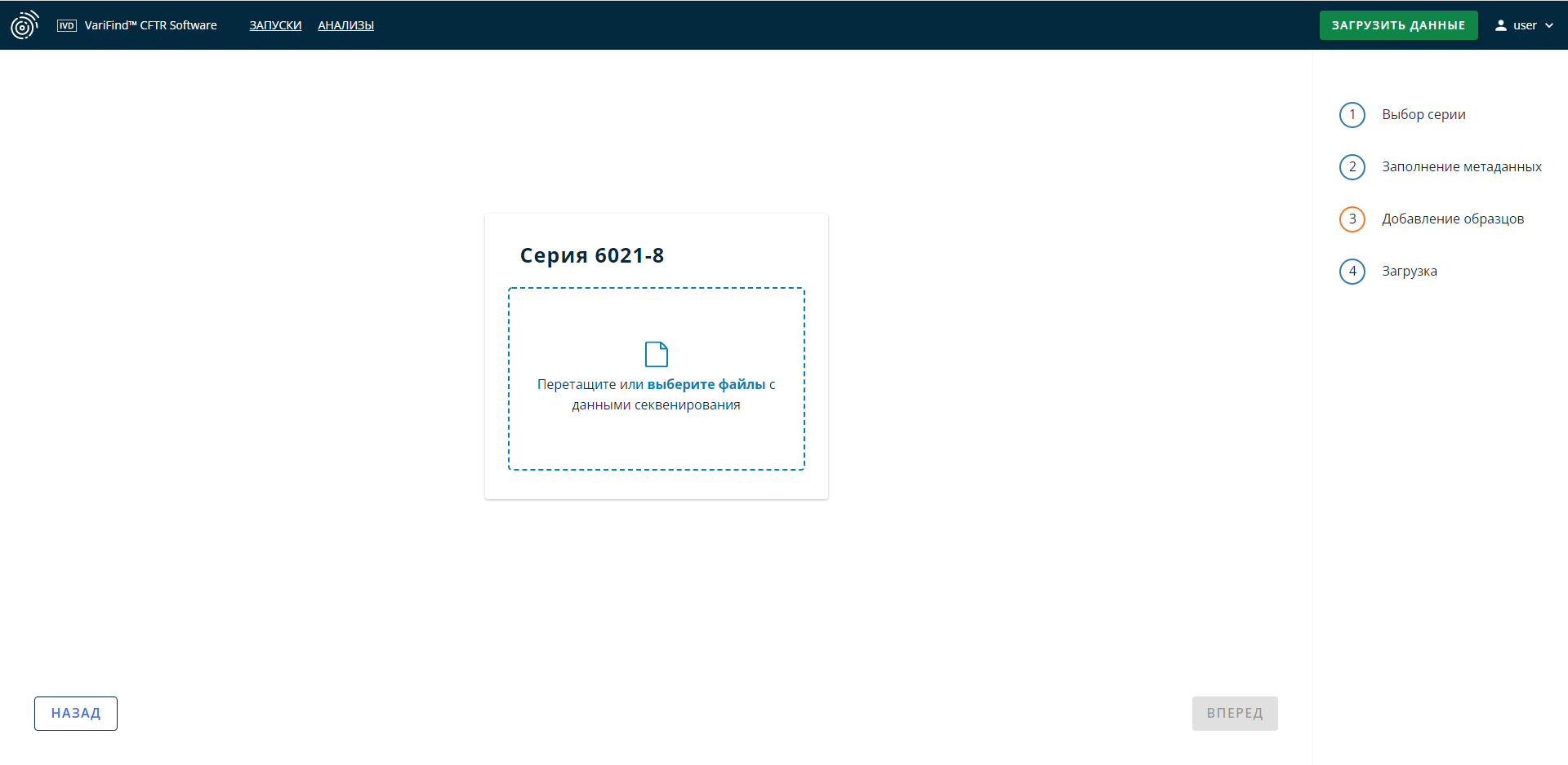 Интерфейс загрузки данных позволяет импортировать результаты секвенирования и информацию о запуске. Для запуска анализа требуется ввести только номер серии реагентов. Все файлы можно загрузить через кнопку «выберите файл» или просто перенеся файл в активное поле. При загрузке укажите контрольный образец постановки и ПО автоматически проверит правильность установленного генотипа.
